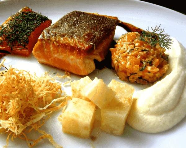 Verschiedene Variationen: (Fjord-) Forelle (gebeizt, mariniert, gebraten) & Sellerie (konfiert, püriert, frittiert) einmal anders zubereitet (6 Portionen). Dazu passt ein trockener Weißwein (Grauburgunder, Grüner Veltliner).