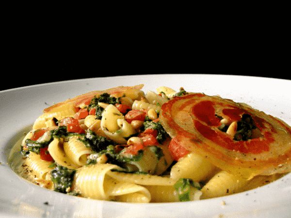 Pancetta-Scheiben zwischen 2 Lagen Backpapier bei 150° 30 Minuten im Ofen trocknen. Die feingewürfelten Schalotten in der Butter andünsten. Mit dem Vermouth und dem Riesling ablöschen und völlig einreduzieren lassen. Den Geflügelfond angießen, ebenfalls bei mittlerer Hitze völlig reduzieren lassen. Die Sahne einrühren mit dem Schneidstab fein mixen, aufkochen lassen. Den Gorgonzola würfeln und unterheben. Den grob gehackten, blanchierten Mangold und eine blanchierte, abgezogene, entkernte und gewürfelte Tomate einrühren. Mit Salz, Pfeffer und Muskat abschmecken. Die al dente gekochten Castellane mit der Sauce mischen. Mit gerösteten Pinienkernen und dem Pancetta anrichten. |