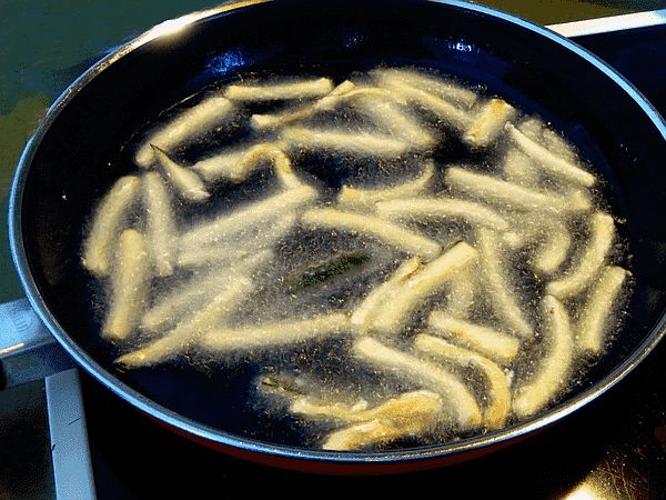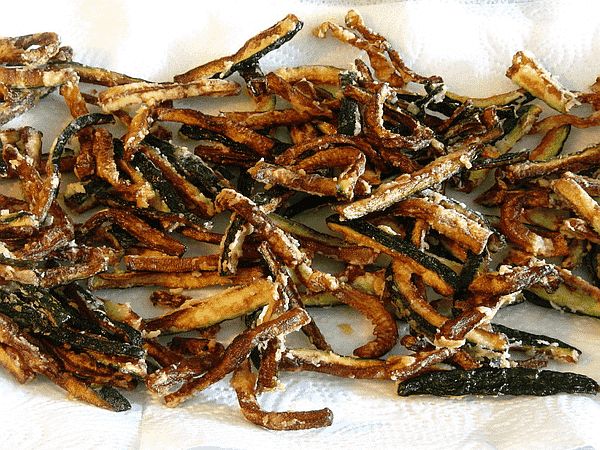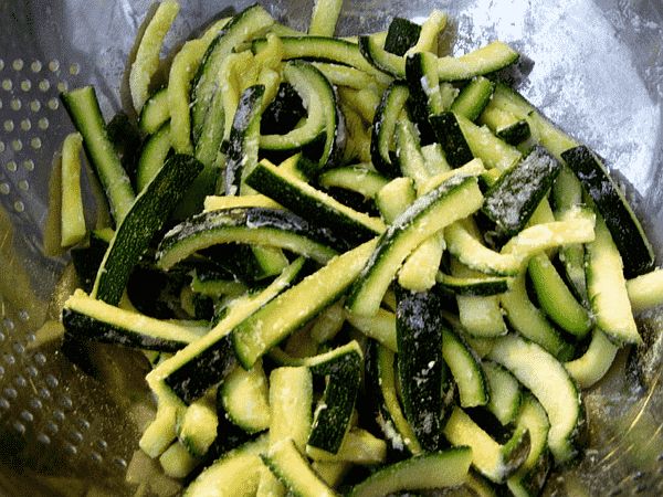 Die jungen Zucchini und eine Weile in kaltes Wasser legen. Damit sie sauber werden. Dann die Stiel- und Blütenansätze abschneiden. Die Zucchini in 6 cm lange und 6 mm breite Streifen schneiden. Datt muss aber nicht so akurat sein, ich hab´ doch kein Lineal in der Küche! Die Stäbchen in ein Sieb geben und salzen. Kräftig, aber nicht zu kräftig! Durchmischen und 2 Stunden (wichtig!) stehen lassen. Dann raus nehmen und mit Küchenpapier abtrocknen. Direkt vor dem Frittieren schnell 50 g Mehl über die Zucchinistäbchen stäuben und durchrütteln. In einer Pfanne 1 cm hoch Pflanzenöl erhitzen. Da schmeißt sie 2 halbierte Knoblauchzehen rein, hellbraun werden lassen, rausnehmen, in die Tonne knallen. Die Zucchini-Streifen portionsweise im heißen Öl schön braun und knusprig frittieren. Auf Küchenpapier abtropfen lassen. |