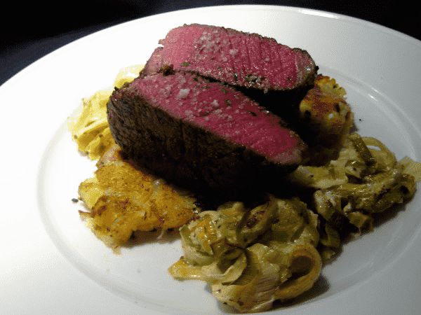 Rinderfilet mit Kartoffelkuchen und Senf-Lauch-Gemüse (2 Portionen) ist ein leckeres und elegantes Gericht. Dazu passt ein Schwarzriesling.