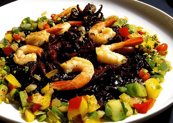 Ein Rezept für die Zubereitung von Schwarzer Risotto mit Moscardini und Garnelen