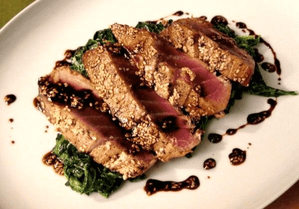 Thunfisch-Steak (4 Portionen) mit Honig und Rahmspinat ist ein schmackhaftes Fisch-Gericht. Dazu passt ein Chardonnay.